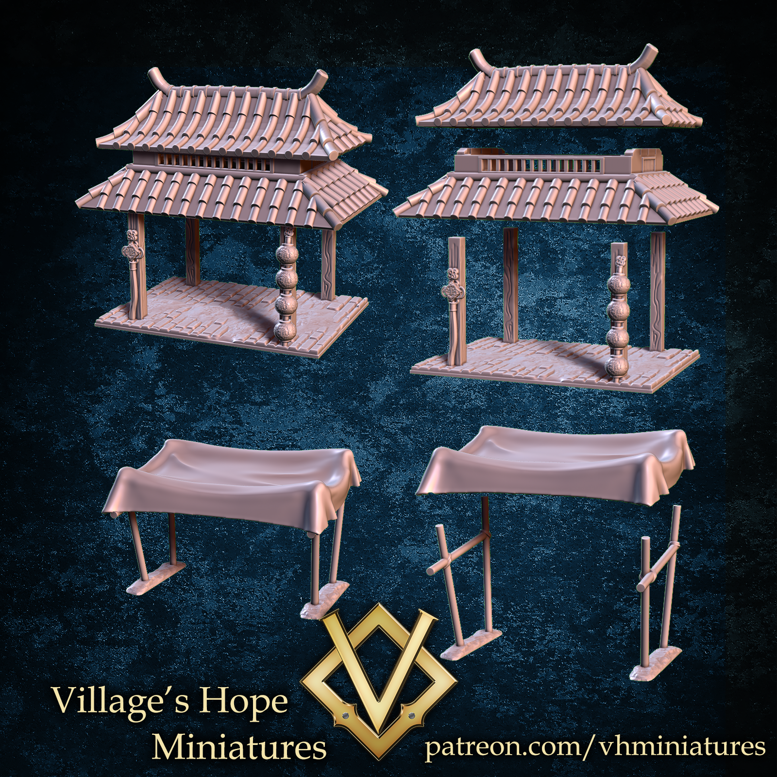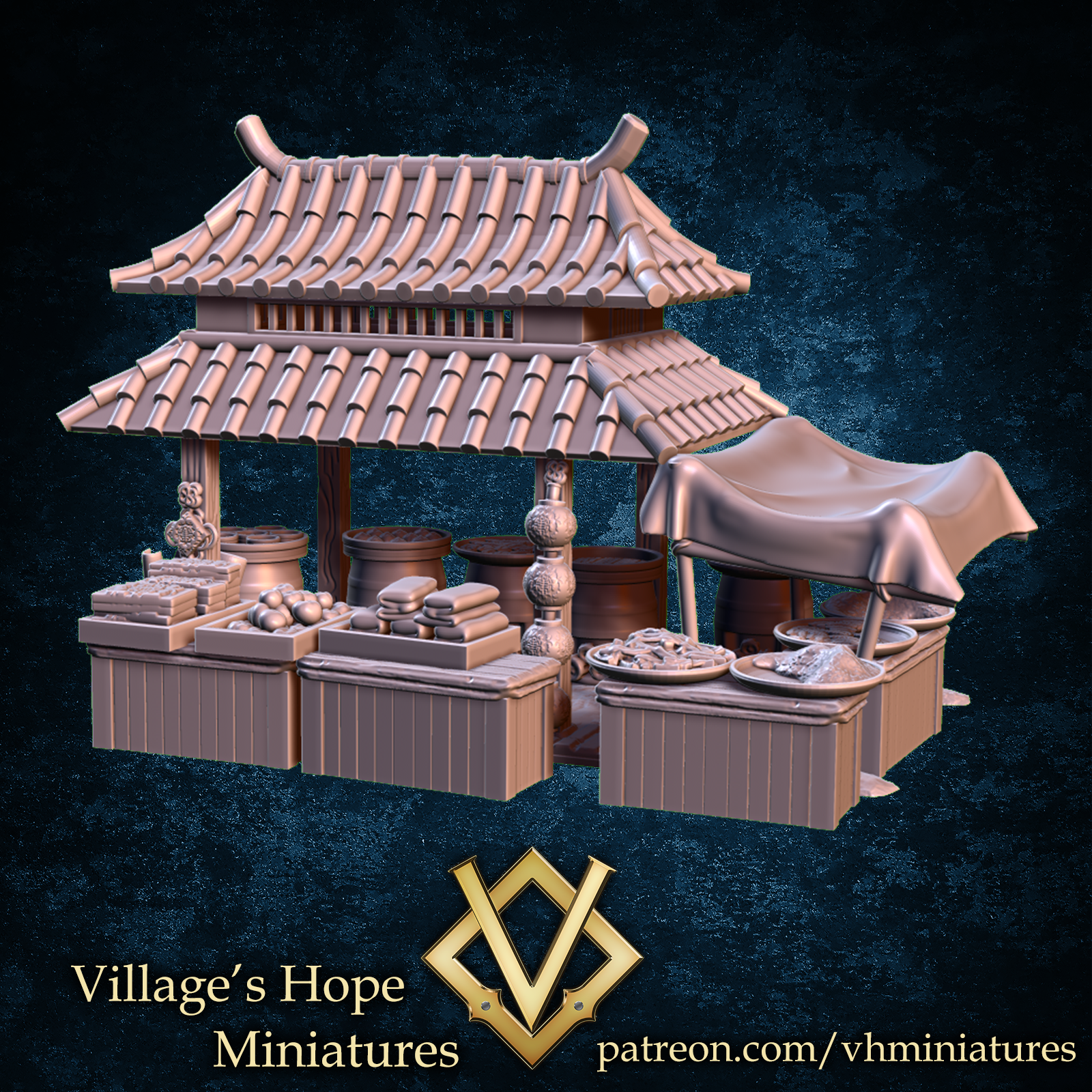 Bring your tabletop world to life with this beautifully detailed Eastern-Inspired Market Stall, ideal for populating vibrant city streets, busy caravan stops, or hidden black markets deep within the empire. With its curved rooflines, decorative cloth canopies, and finely crafted wooden structure, this stall adds cultural depth and narrative flavor to any fantasy setting.