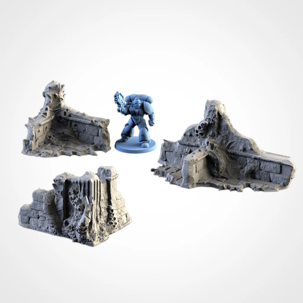 • 10 unique ruined structures ranging from single to triple storeys for varied battlefield height and cover.