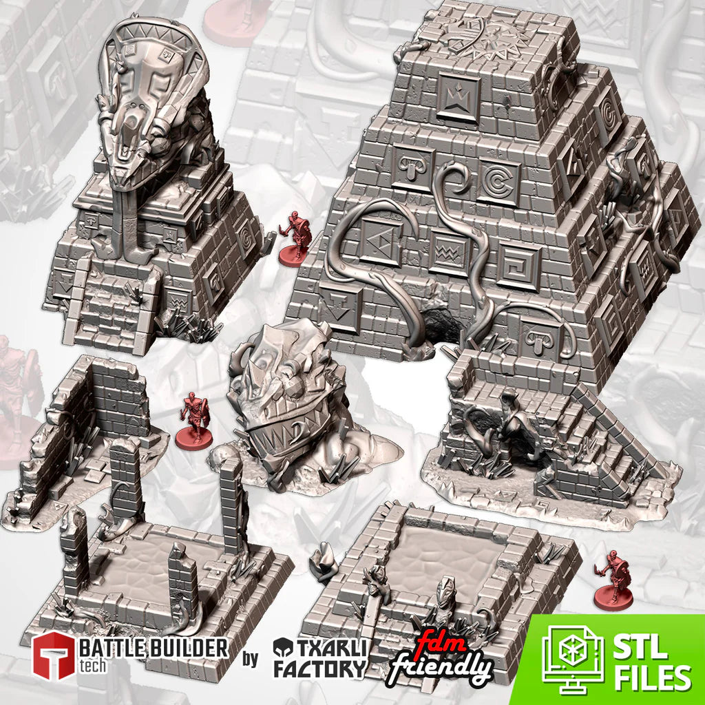 Venture deep into the heart of the jungle and uncover the Jungle Lost City, an ancient Aztec-inspired ruin reclaimed by nature. This terrain pack brings your tabletop to life with moss-covered pyramids, crumbling temples, sacred fountains, and colossal statue heads — all designed to transform your gaming board into an overgrown realm of mystery and forgotten power. Perfect for narrative battles, skirmishes, or RPG adventures lost to time.